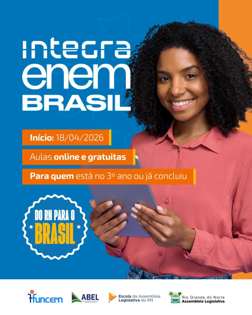 O Integra ENEM Brasil é uma iniciativa educacional voltada à preparação de estudantes do Rio Grande do Norte para o Exame Nacional do Ensino Médio (ENEM), oferecendo aulas online e gratuitas com foco na qualidade do ensino e no acesso democrático à educação. O programa é destinado a alunos do 3º ano do ensino médio e também àqueles que já concluíram essa etapa, proporcionando reforço nas principais áreas do conhecimento, orientação estratégica para a prova e incentivo à continuidade dos estudos. Com início em 18 de abril de 2026, o projeto busca ampliar oportunidades e contribuir para o ingresso dos participantes no ensino superior. Faça já sua Inscrição!